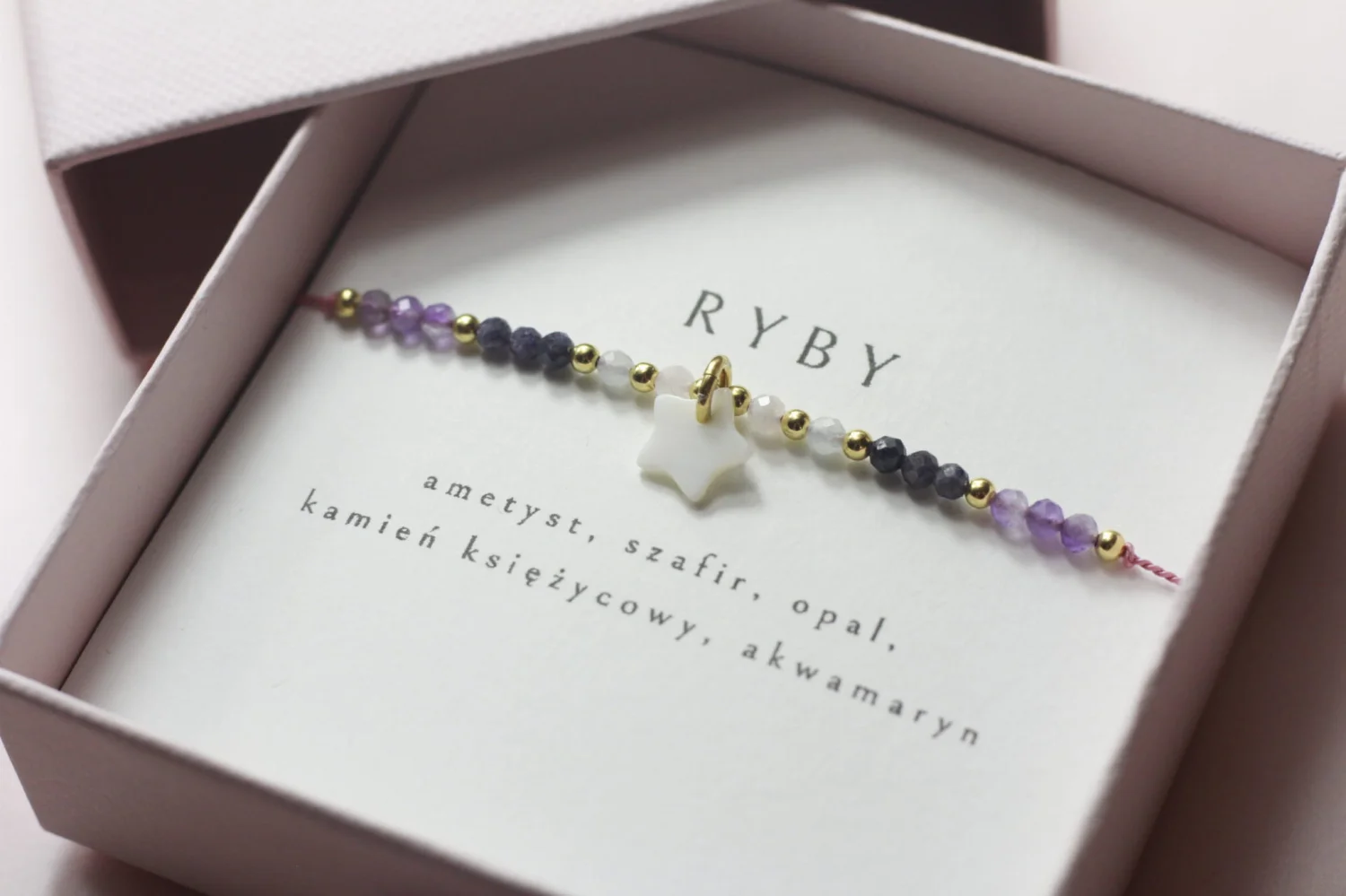 Bransoletka na jedwabnej nici z zawieszką w kształcie gwiazdki z masy perłowej, w towarzystwie opalu, kamienia księżycowego, szafiru, akwamarynu, ametystu oraz srebrnych złoconych 24-karatowym złotem kuleczek. Bransoletka posiada stoper, który zapewnia dogodną regulację długości.